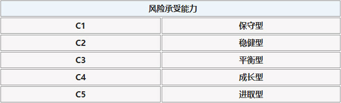 1. Assessment of investor risk tolerance    & nbsp; The level of ability is divided into at least five types from low to high: C1, C2, C3, C4, and C5.